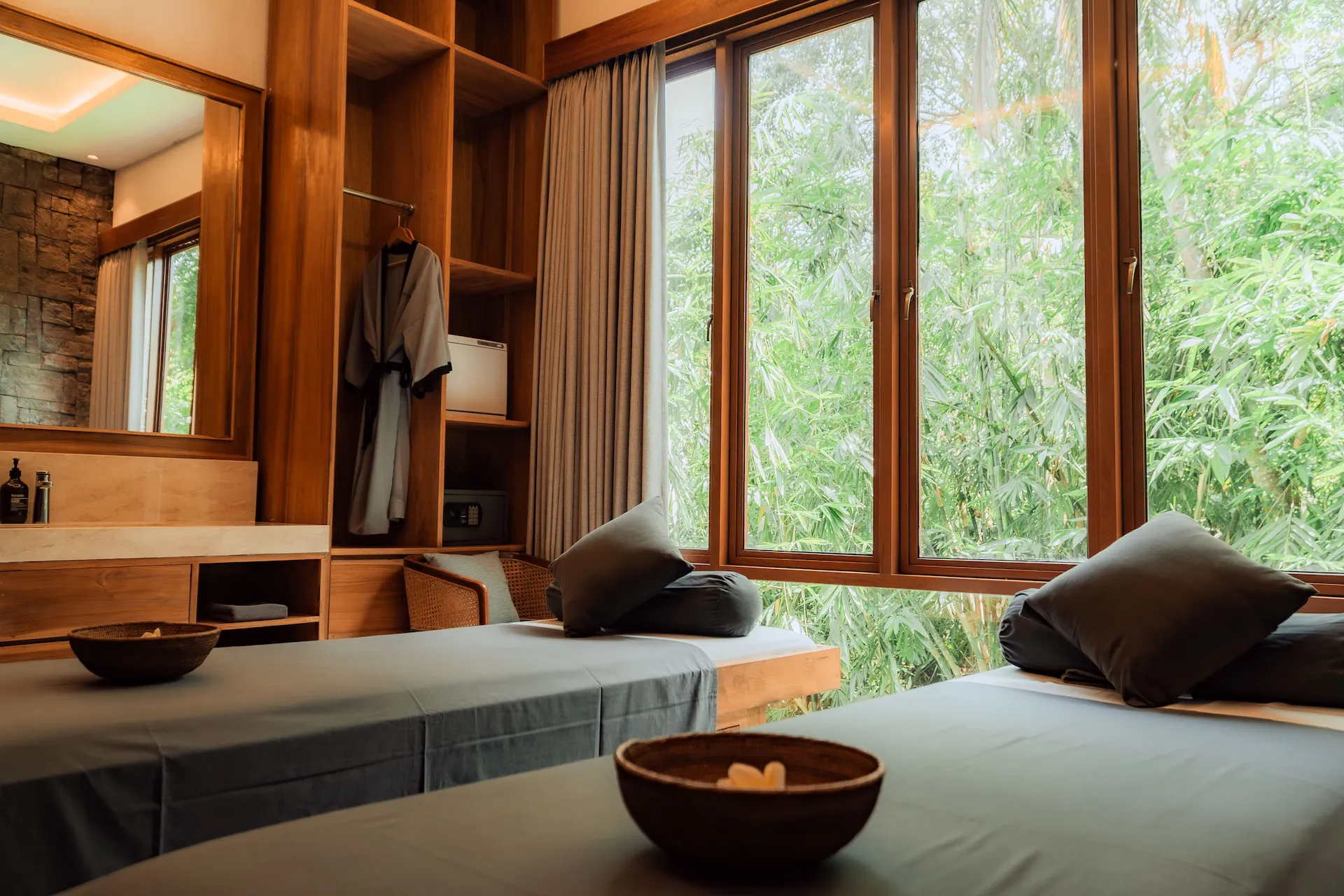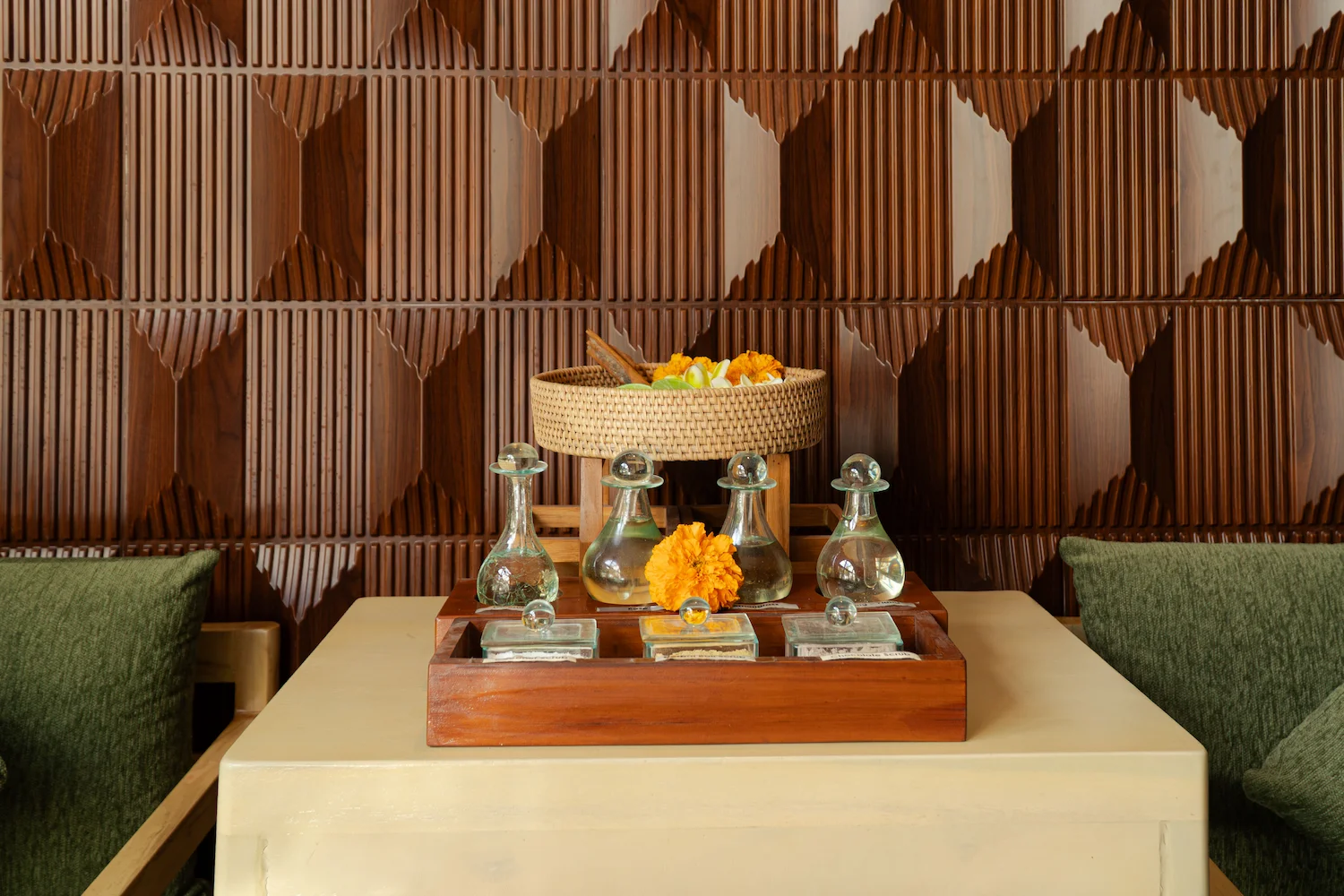 Featuring natural bamboo textures and earthy tones, this room creates a soothing retreat for rejuvenating full-body treatments.